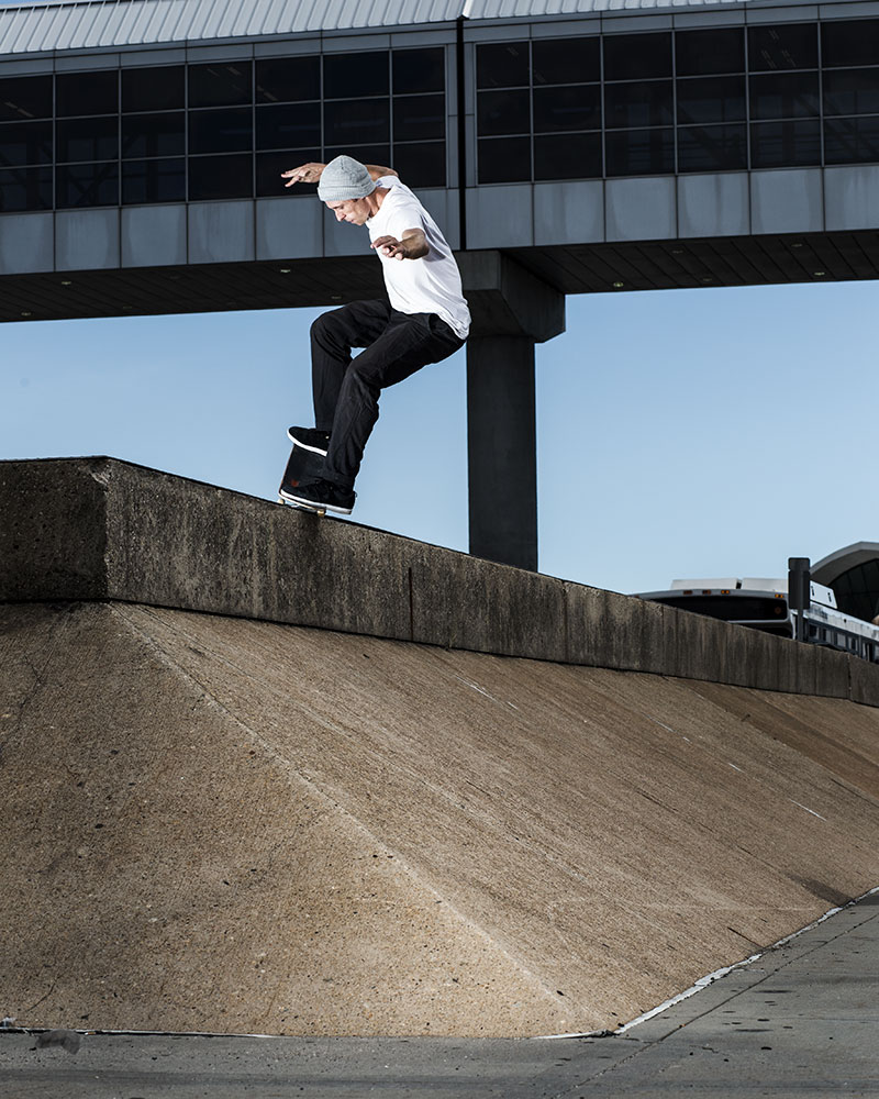 So, the story is that for the last year or so I've been scoping that spot from Manhattan. It's on Roosevelt Island in between Manhattan and Queens and the bank is so massive you can see it from miles away. A few people have skated it but it's a super quick bust. The spot you hit sits directly in front of the security booth, so no matter what you only get a few tries skating it before they obstruct your path and kick you out. Also, they don’t let you walk in with skateboards so I had to hide my board in my backpack and wait for the filmers and photographer to be ready before I went for it. Frankie Spears rolled with me and we both got lucky and had enough time to get our tricks back to back. We were hyped when we rolled away!