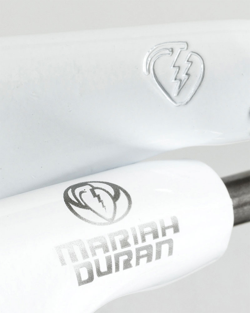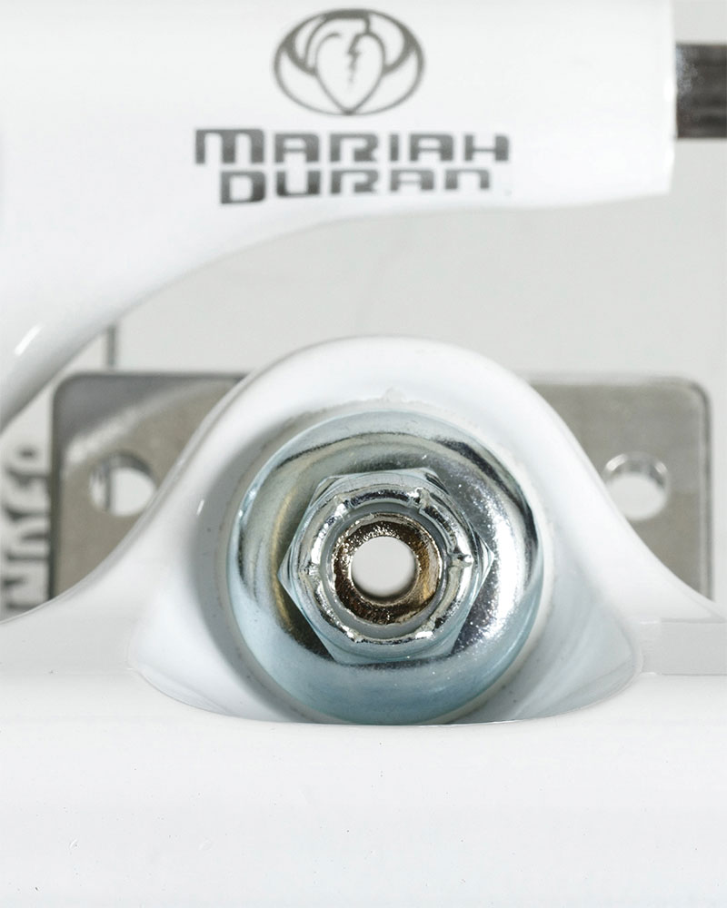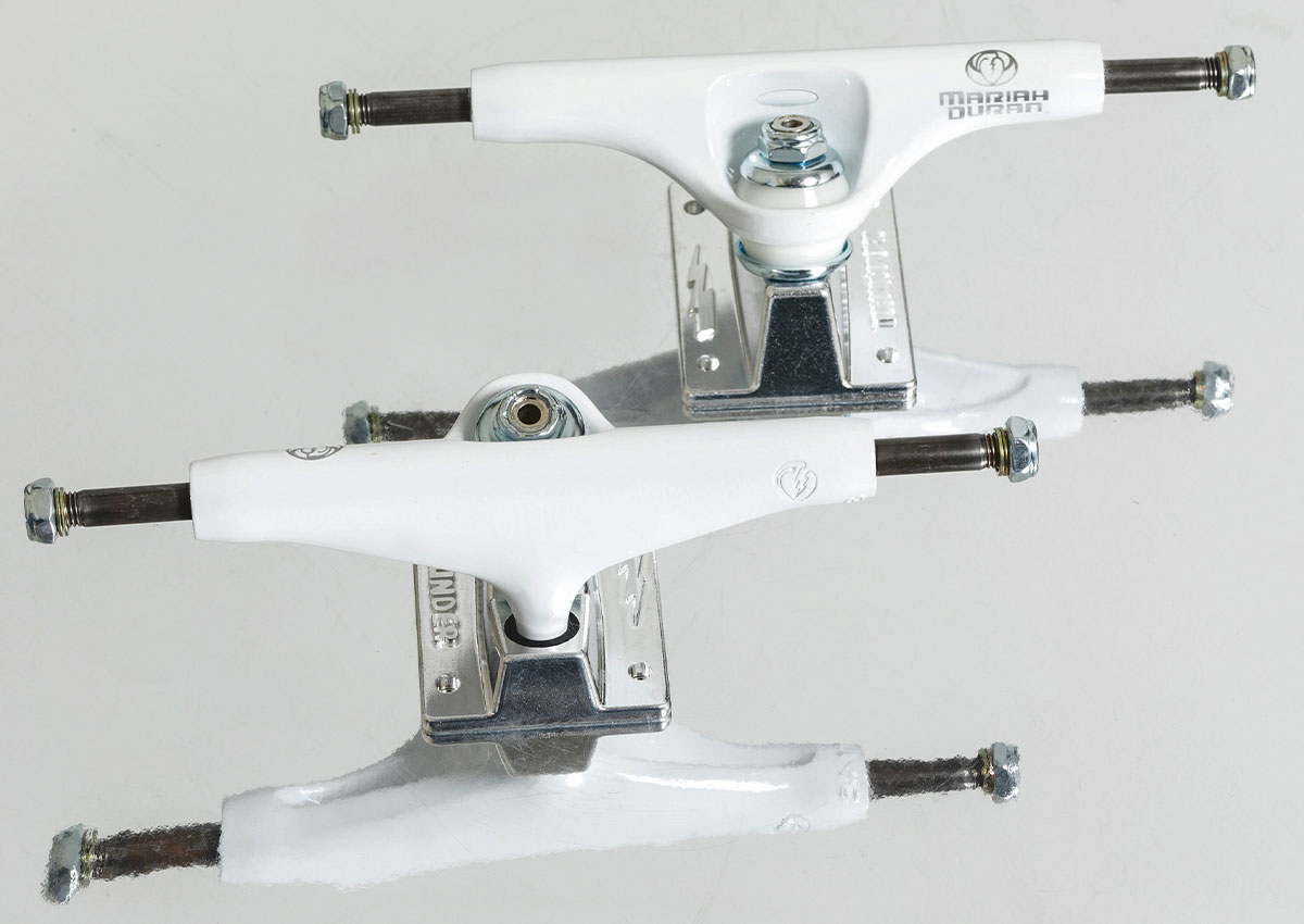 Keep your eye out for Mariah's first-ever Pro truck. Gloss white custom Stamped Grenade Hollow Lights with Forged Aluminum Baseplates, Extra-Strong Hollow Axles, Hollow Kingpins, and White 90DU Thunder Bushings. Available in 147 and 148 at your local shop.